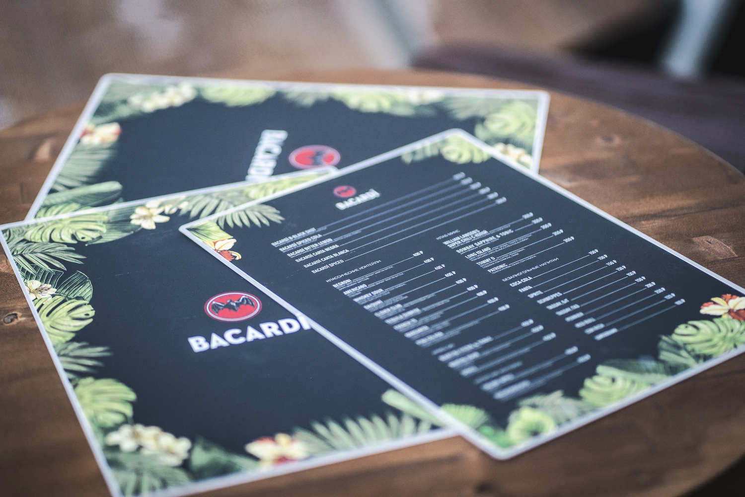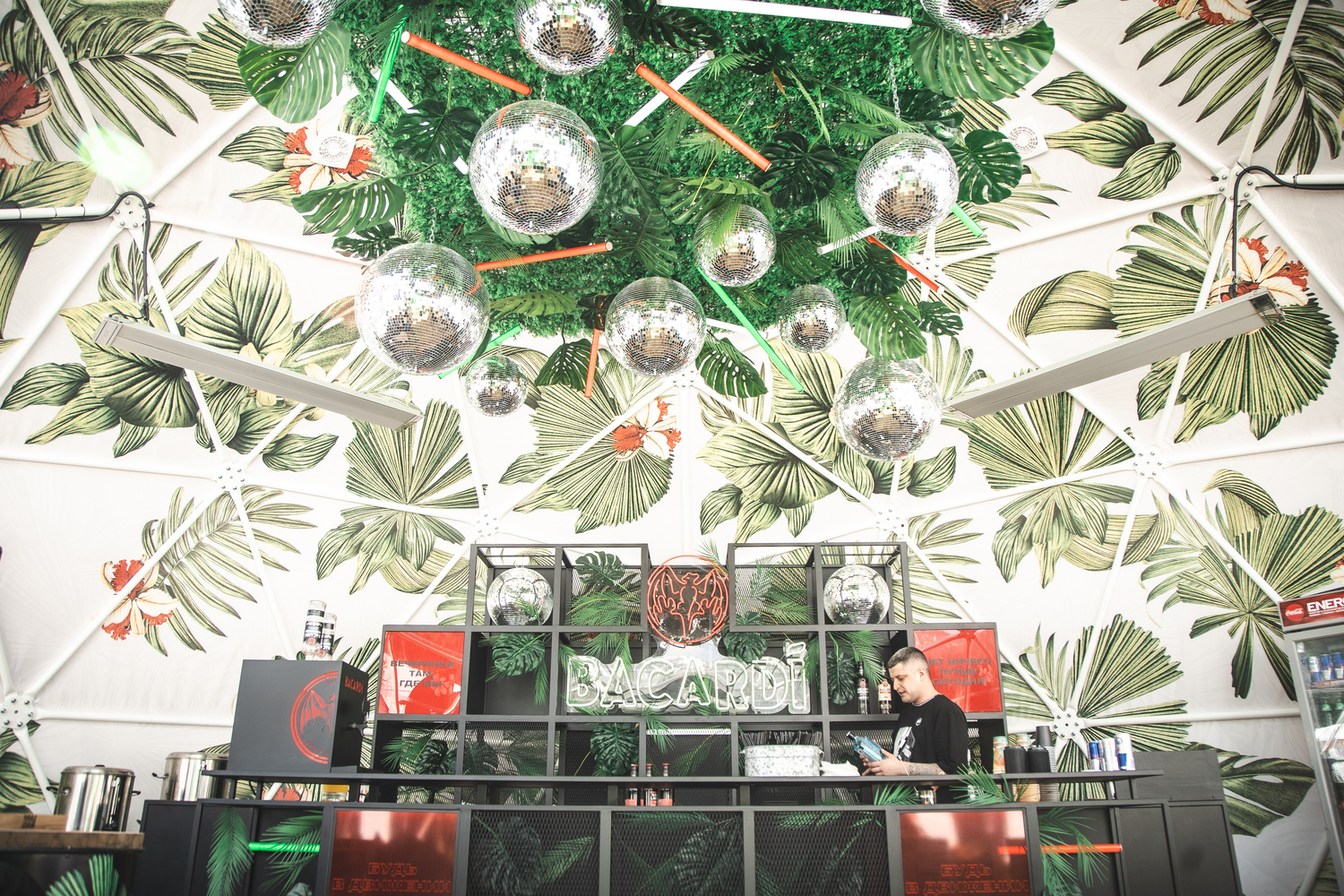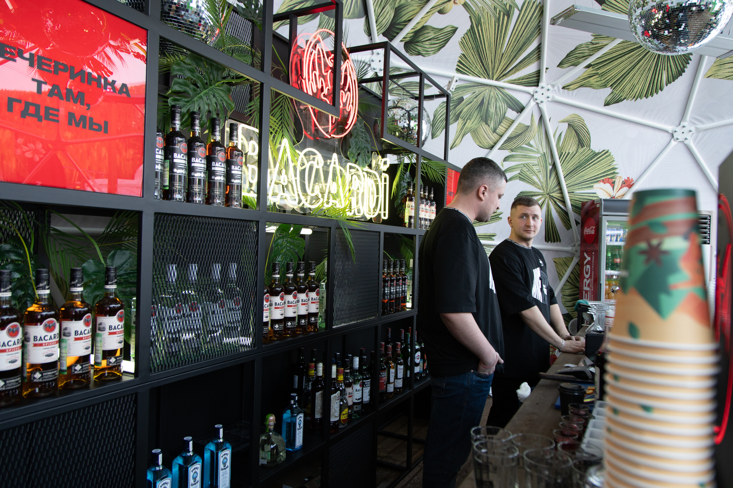 В одной части пространства разместили закрытый тент с барной стойкой, бочками, стульями и диджейской стойкой, добавили в интерьер зелень, диско-шары и неон. В другой половине обустроили открытую зону с местами для чила. Сделали дизайн меню, тейбл-тентов и подачи напитков — все в стиле бренда.