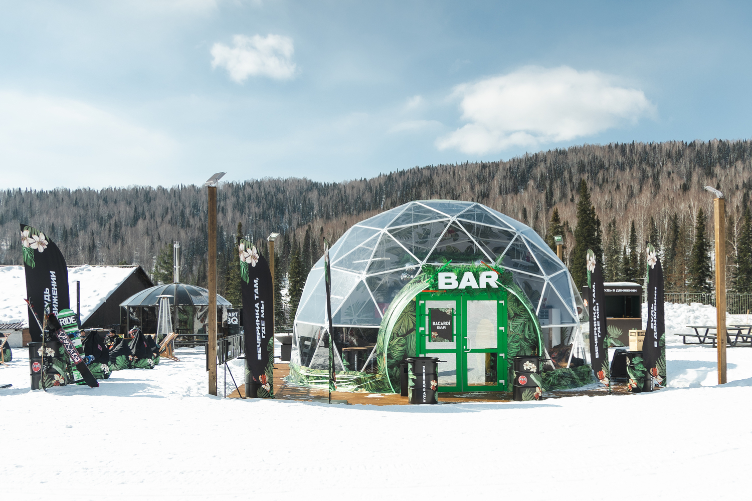 Джунгли посреди заснеженных склонов — так бы мы описали бар, который построили для BACARDI на горнолыжном курорте Шерегеш. В другой половине обустроили открытую зону с местами для чила. Собрали лучшие кадры с места событий в подборке фото.