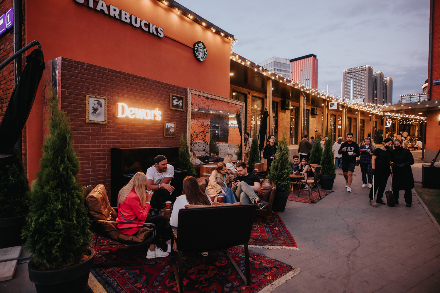 Большой бар на центральной площади — с карибским вайбом: песок, шезлонги и сумасшедшие пальмы цвета «тиффани».