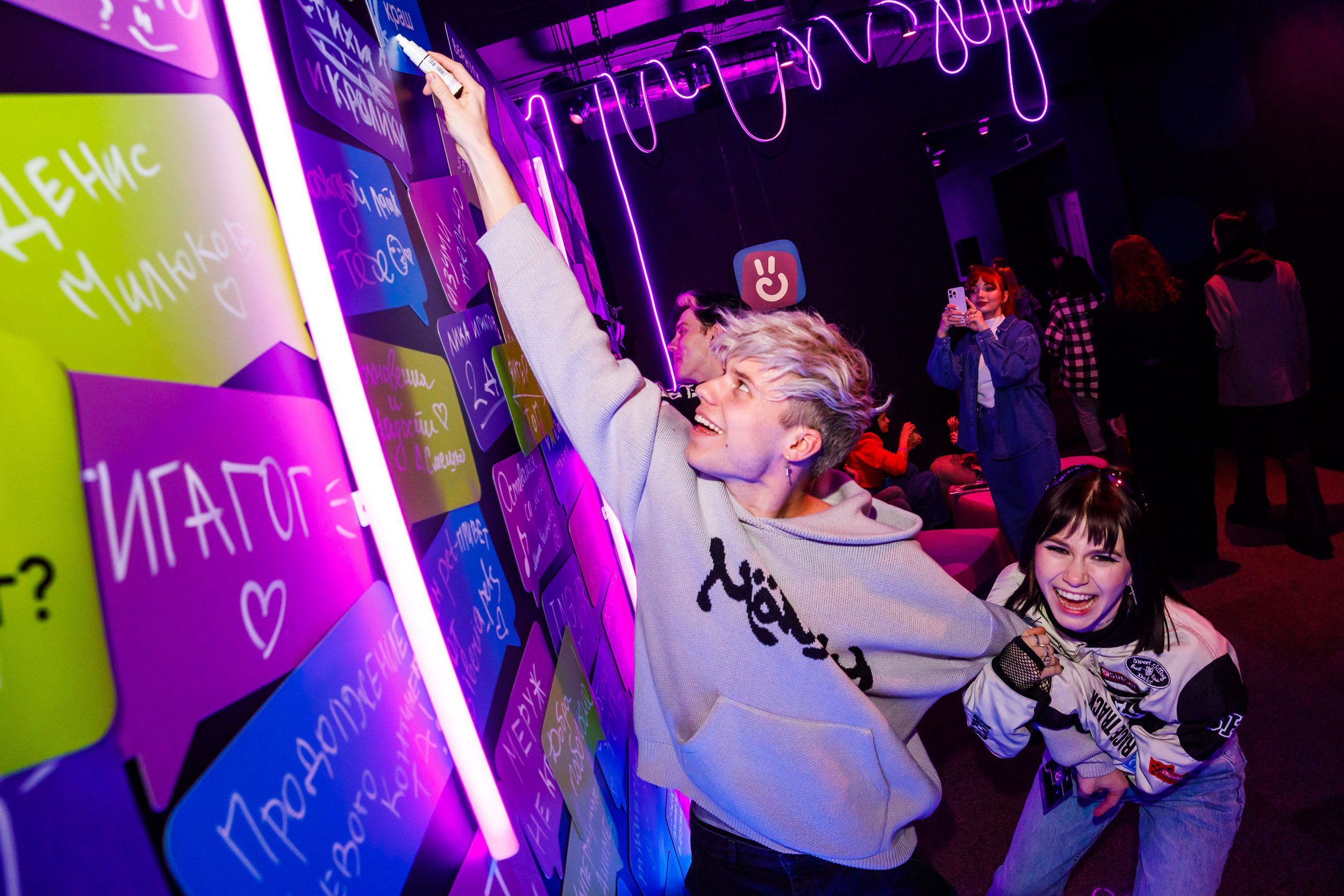 Также сделали на площадке активности: стену, где можно оставить комментарий в виде стикера, комнату для отдыха на пуфах за просмотром лучшего контента.