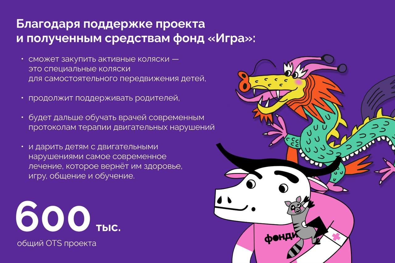 Совместно с командой агентства был разработан яркий сайт, герои которого в формате игры рассказали о процессе терапии и адресной помощи детям с двигательными нарушениями. А для дополнительного продвижения мы создали динамичный анимационный ролик, который красочно и доступно рассказывал об идее спецпроекта.