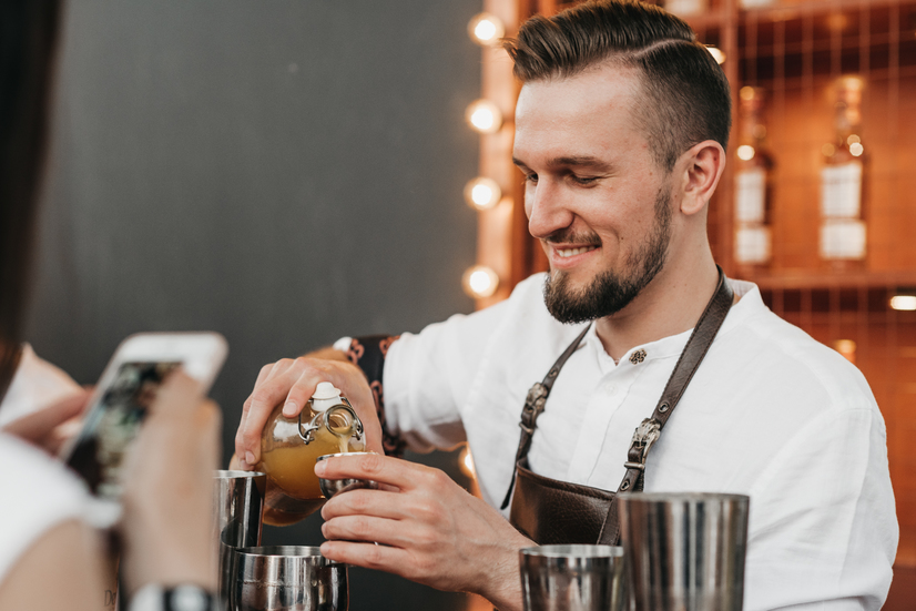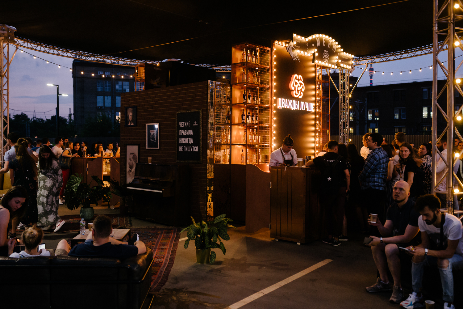 Основной акцент был сделан на центральный бар, где можно было эксклюзивно получить алкоголь на фестивале. Под большим купольным шатром мы разместили два бара-близнеца, зеркально отражавших друг друга. Кроме баров, близнецами были и бармены. Дело в том, что основная идея бренда звучит как “дважды лучше”. Тему дуальности мы протянули через всю коммуникацию, как и культ личности Томаса Дюэра, одного из сыновей основателя бренда. Его остроумные цитаты украсили бумажные стаканчики, а импровизированная гостиная стала зоной отдыха, с портретом хозяина на большом зеркале. Получилось атмосферно, гости беседовали и потягивали коктейли на удобных диванах.