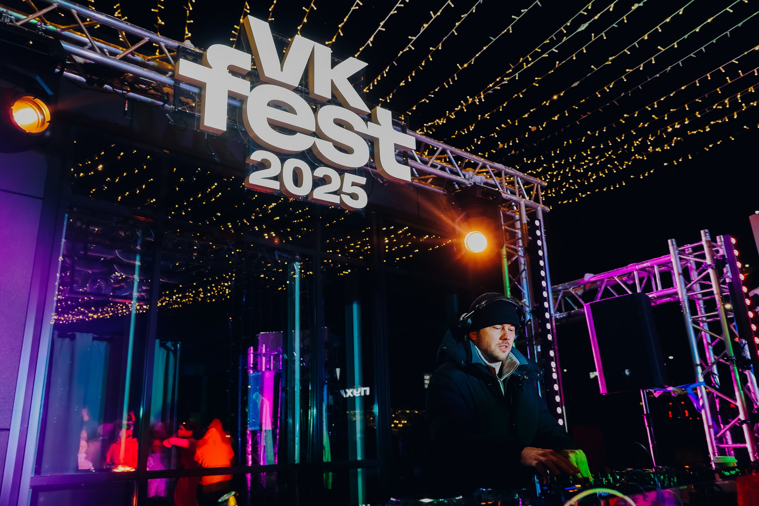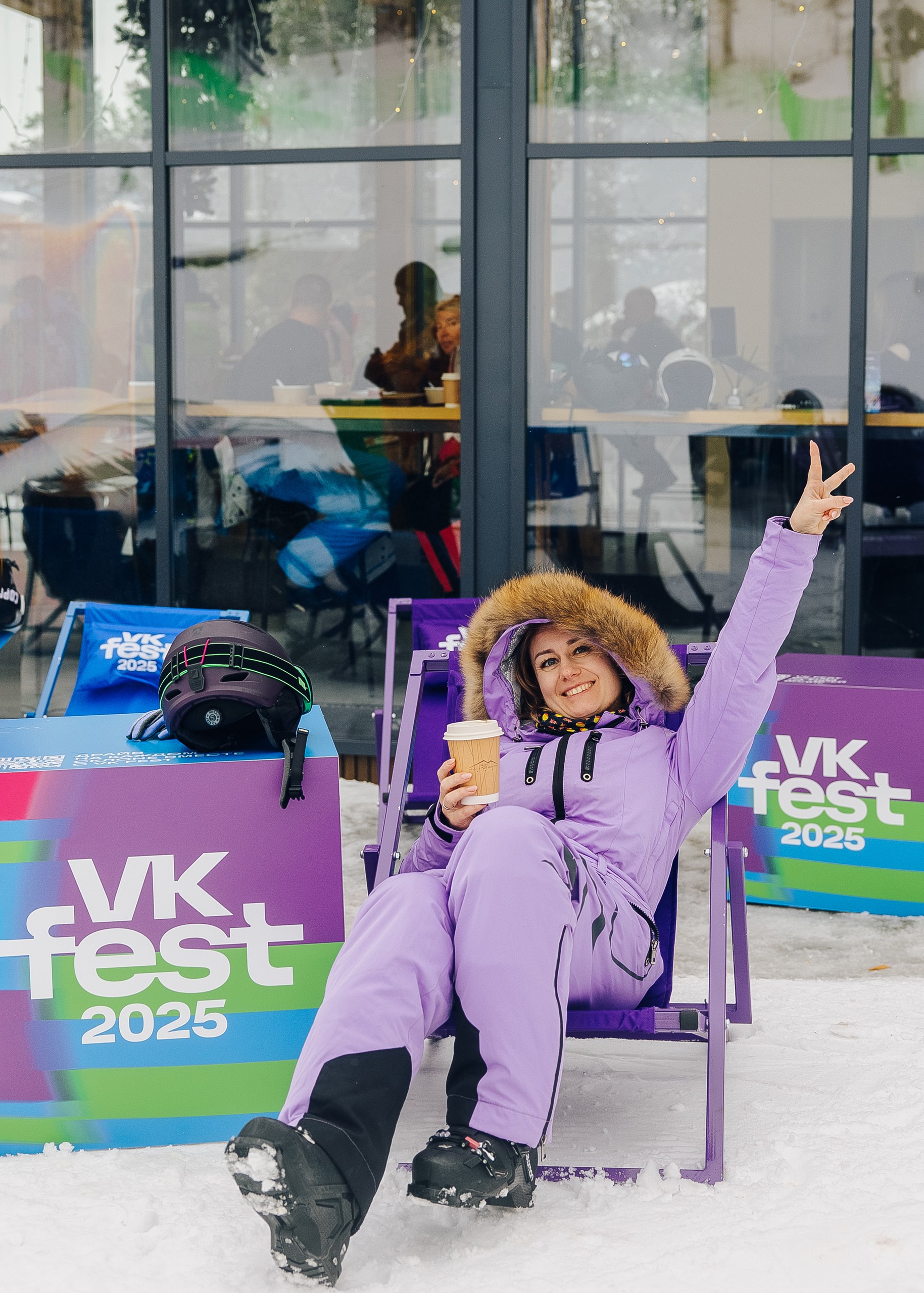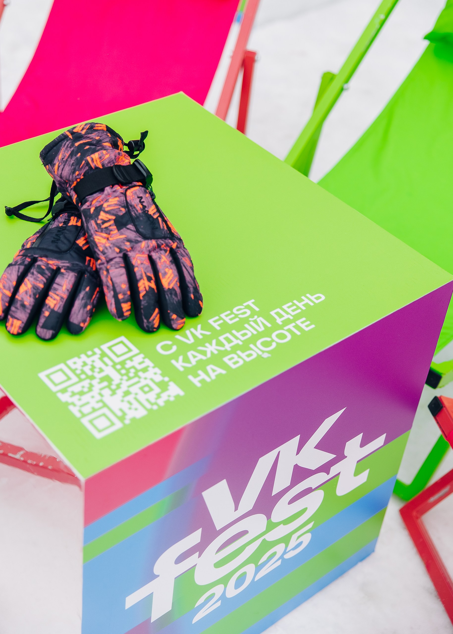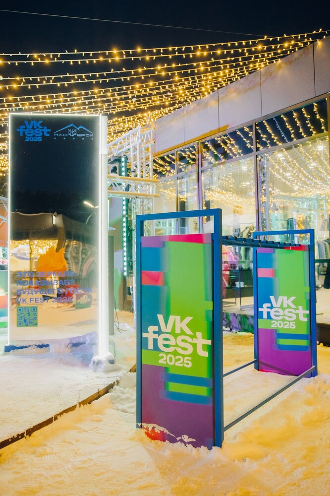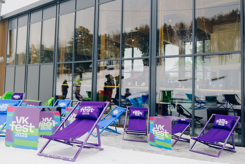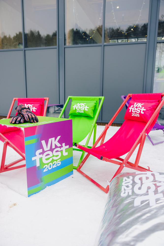 Мы интегрировали бренд VK в горнолыжный курорт «Манжерок» и установили бренд-зону от VK Fest. Внутри: лаунж-пространство, брендированные подушки для отдыха, стойки для лыж и сноубордов, столики с QR-кодами для покупки билетов на VK Fest и стильная фотозона.