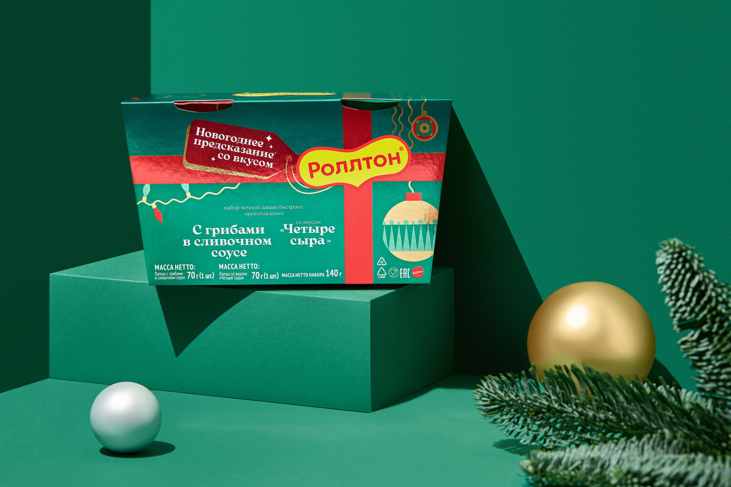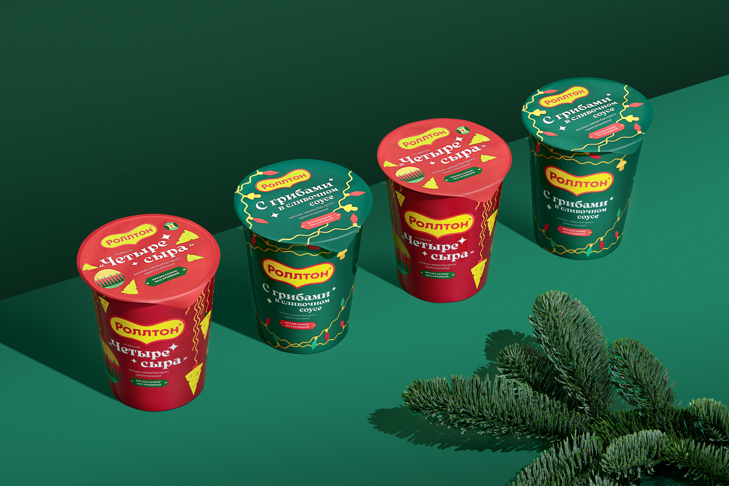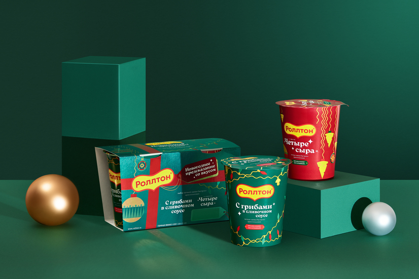Использовали элементы праздника и узнаваемые цвета Нового года — красный и зеленый. Объединили всё это со вкусами нового набора лапши «Роллтон». Получилась стильная упаковка с «лапшичной» гирляндой, грибочками, елочными игрушками в виде сыра и позитивными предсказаниями, спрятанными под крышками любимых вкусов. Новогоднее настроение было обеспечено!
