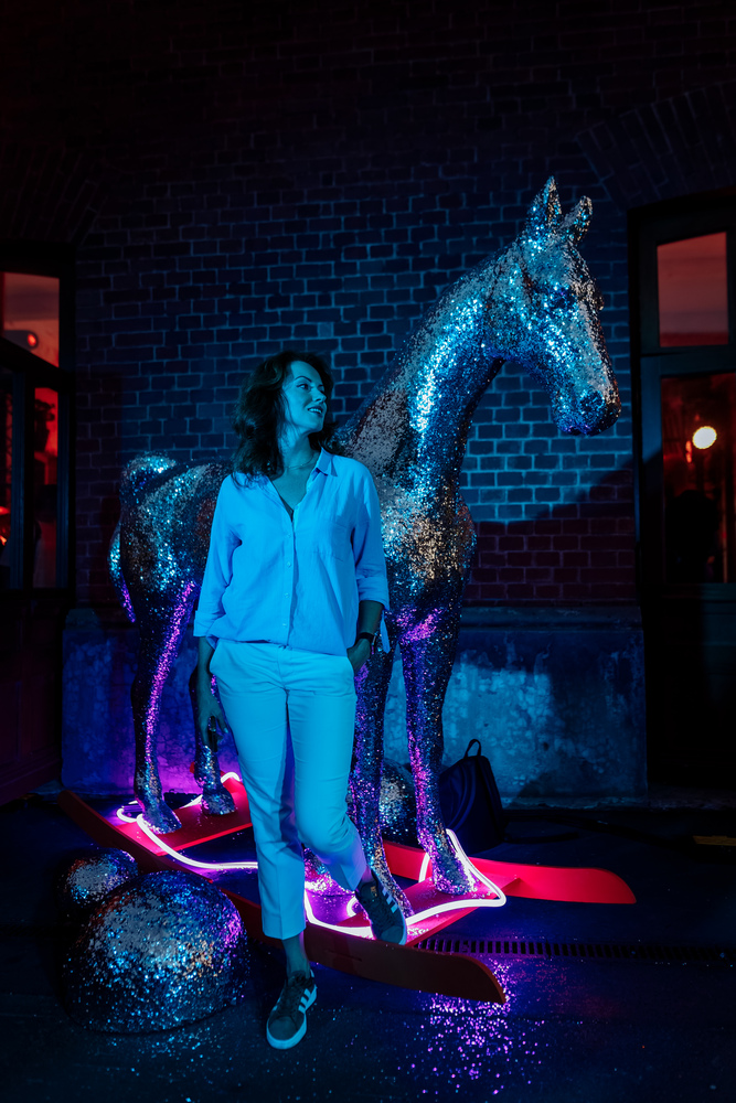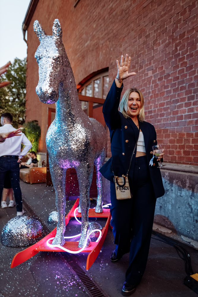 На вечеринке мы создали несколько зон, где блогеры могли снять яркий контент. Одной из самых популярных зон стала инсталляция с disco-лошадью в натуральную величину. Инсталляция встречала гостей при входе и стала первой точкой вдохновения для создания контента.