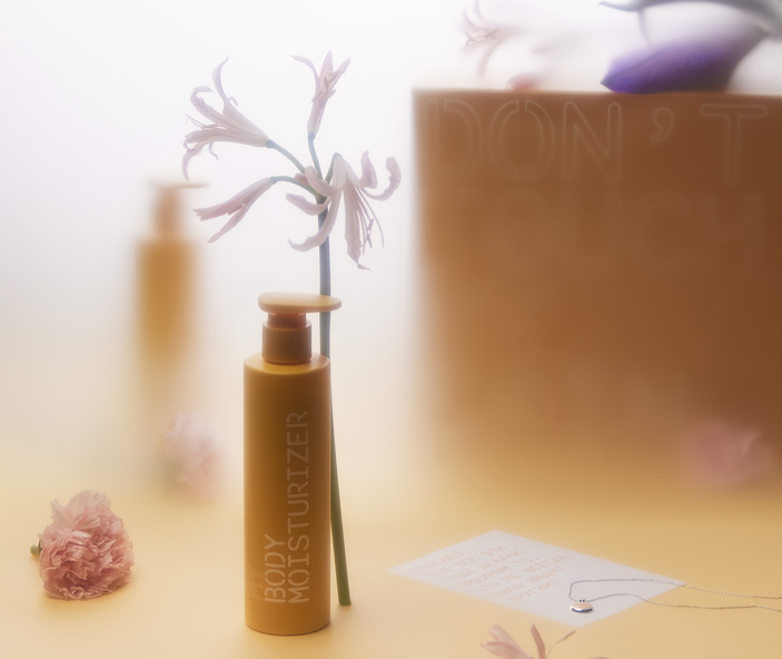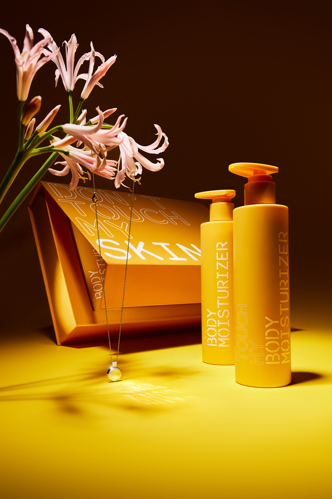 Внутри подарочного набора новое гель-масло, крем для тела, открытка и кулон с отсвечивающейся надписью Don't Touch My Skin. Кадры со съемки набора буквально переносят в теплую весну, а фирменные цвета бренда отсылают к телесности, умиротворению и природе.