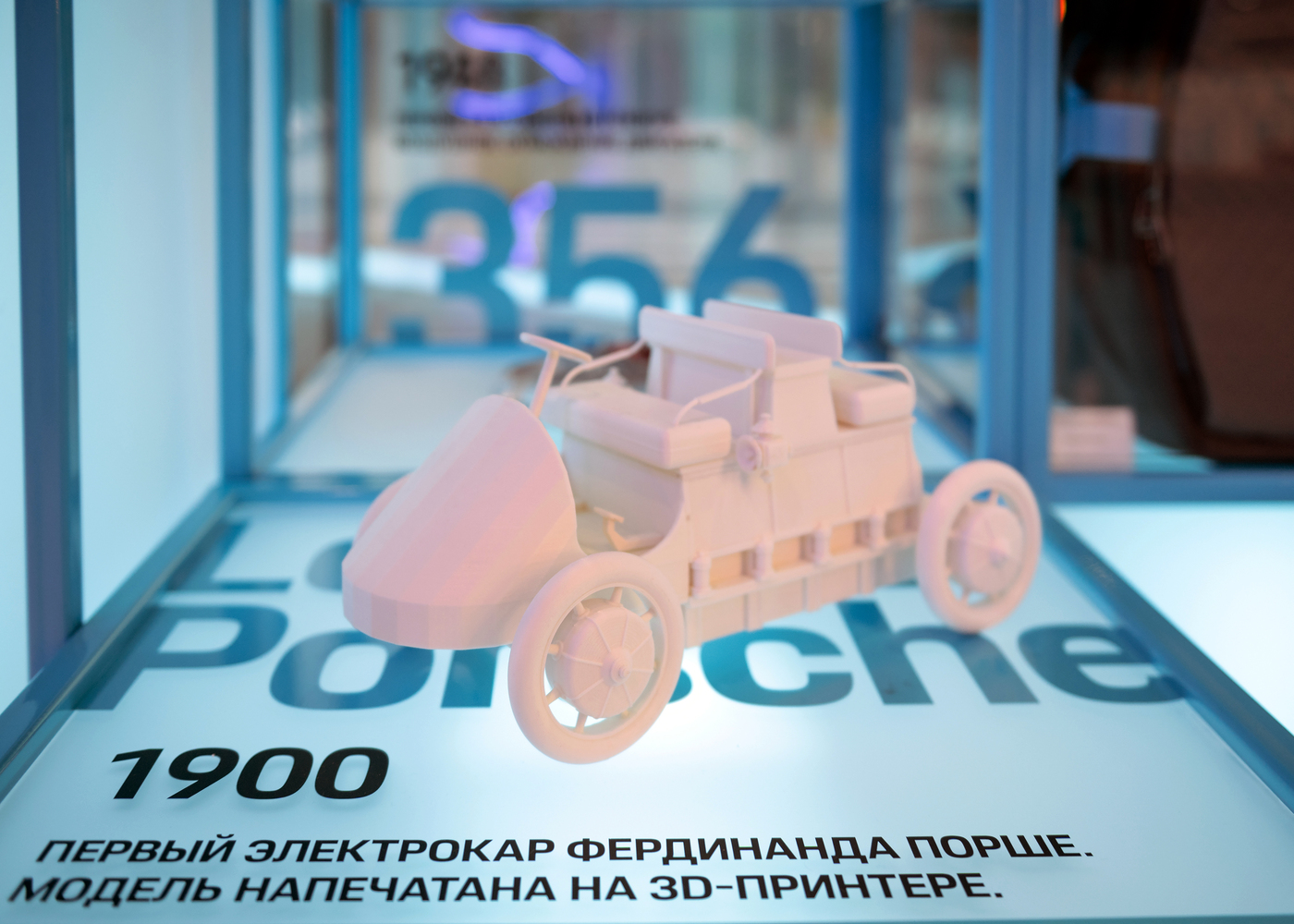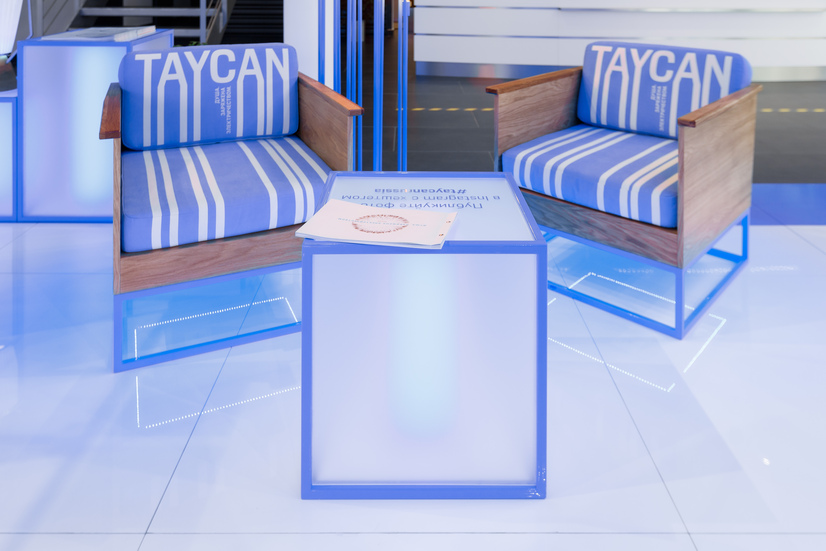 Историю бренда и идеалы марки раскрыли в экспозиции с помощью декора: разместили пьедестал и гоночные кубки, коллекционные модели и 3D-миниатюры первого в мире электрокара. “Душу” и связь нового электромобиля с классической версией 911 передавал чертеж, который как нимб располагался над крышей Taycan. «Электричеством» была наполнена вся экспозиция: мы подчеркнули электрокоммутацию в логотипе, активно подсвечивали предметы в самой экспозиции, все пространство оживало за счет энергии света, ламп Эдисона и неоновой подсветки.