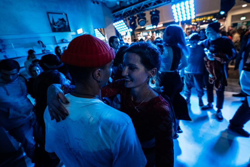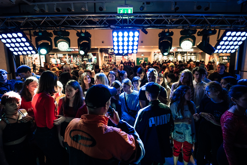 Мы добавили в интерьеры магазина голограмму инста-маски в стиле Карла, которую разработали специально под запуск –– черные очки, воротничок. Узнать побольше, затестить и полюбоваться можно было с помощью QR-кодов, заботливо размещенных на самых видных местах. Собралась огромная толпа танцоров, и формат вог-джема органично расширился до фристайла. Многие участники поддержали цветовую гамму новой коллекции, получилось красиво.