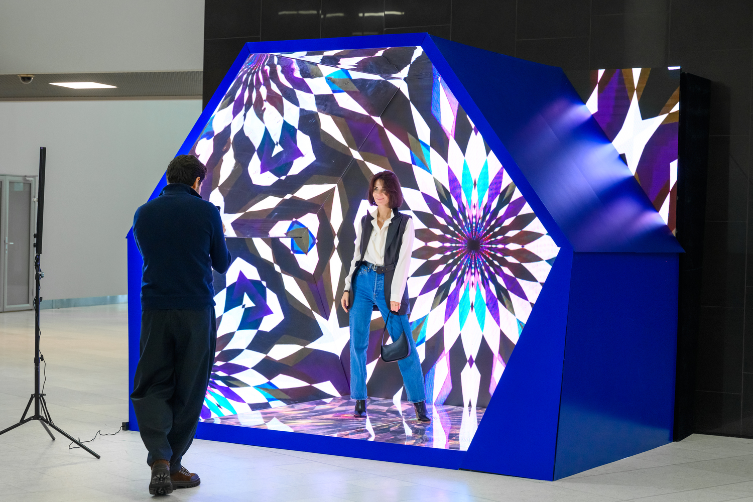 Площадку мы украсили световой арт-инсталляцией и арт-объектом в виде зеркального шестиугольника. В общем пространстве соорудили 50-метровый стол для обеда и красиво сервировали его белой скатертью, ветками зелени и свечами. Это помогло всем расслабиться и познакомиться поближе.