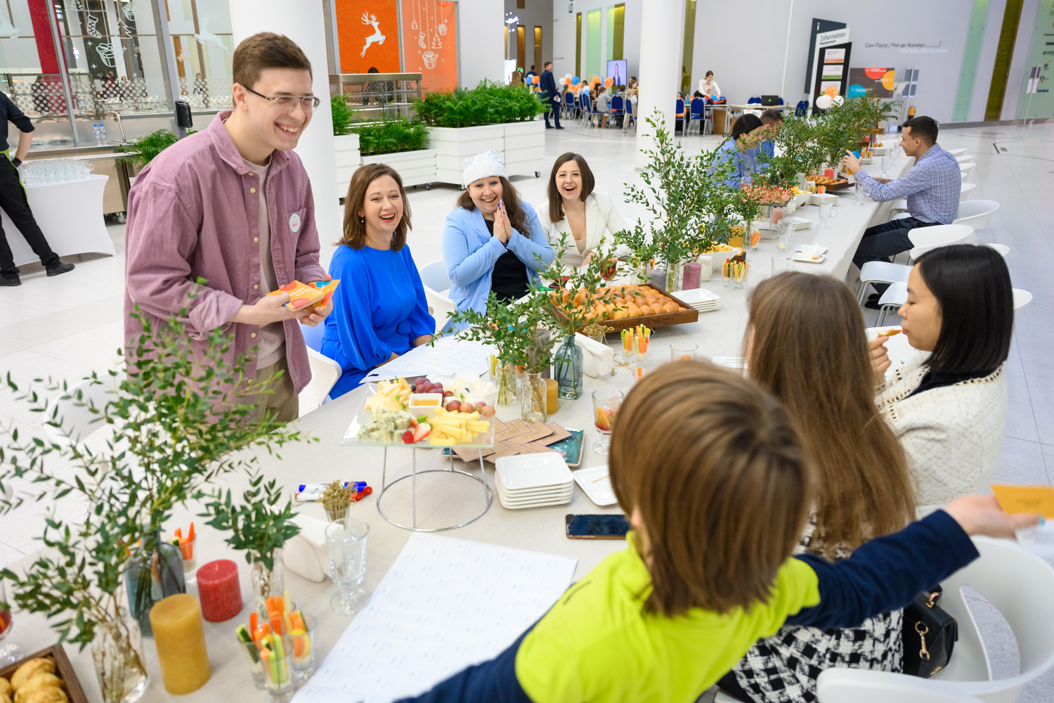 Гостей мы вовлекли в общение при помощи игры, где они отвечали на вопросы из карточек и обсуждали ответы друг друга. А еще перед гостями выступили: скрипач, балерины, фристайлер с мастер-классом по битам и артисты из театра теней.